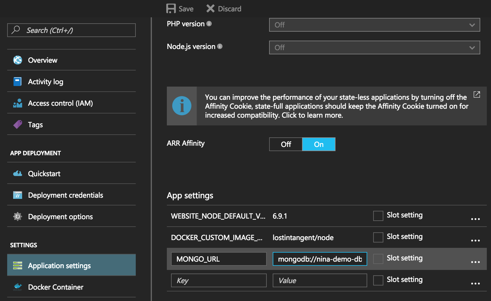 Yay! We just deployed our app. However, the spinning icon indicates that the app can't connect to the database, which makes sense because we were using a local instance of MongoDB during development, which obviously isn't reachable from within the Azure datacenters. Fortunately, since we updated the app to accept the connection string via an environment variable, we just need to spin up a MongoDB server and re-configure the App Service instance to reference it.