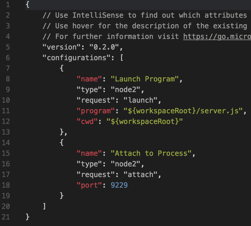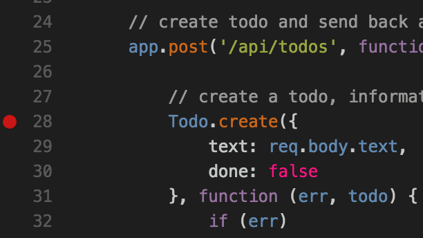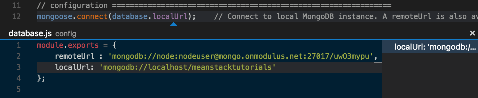 Auto-completion can provide huge productivity enhancements when writing/exploring code, since it prevents you from needing to keep referencing documentation or worrying about API typos. For example, let's augment the hardcoded MongoDB connection string with an environment variable by changing line 12 from this: