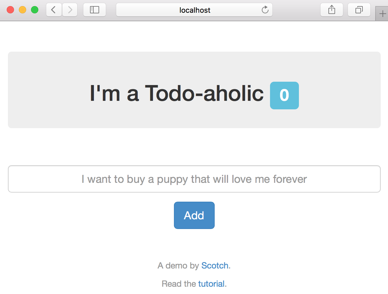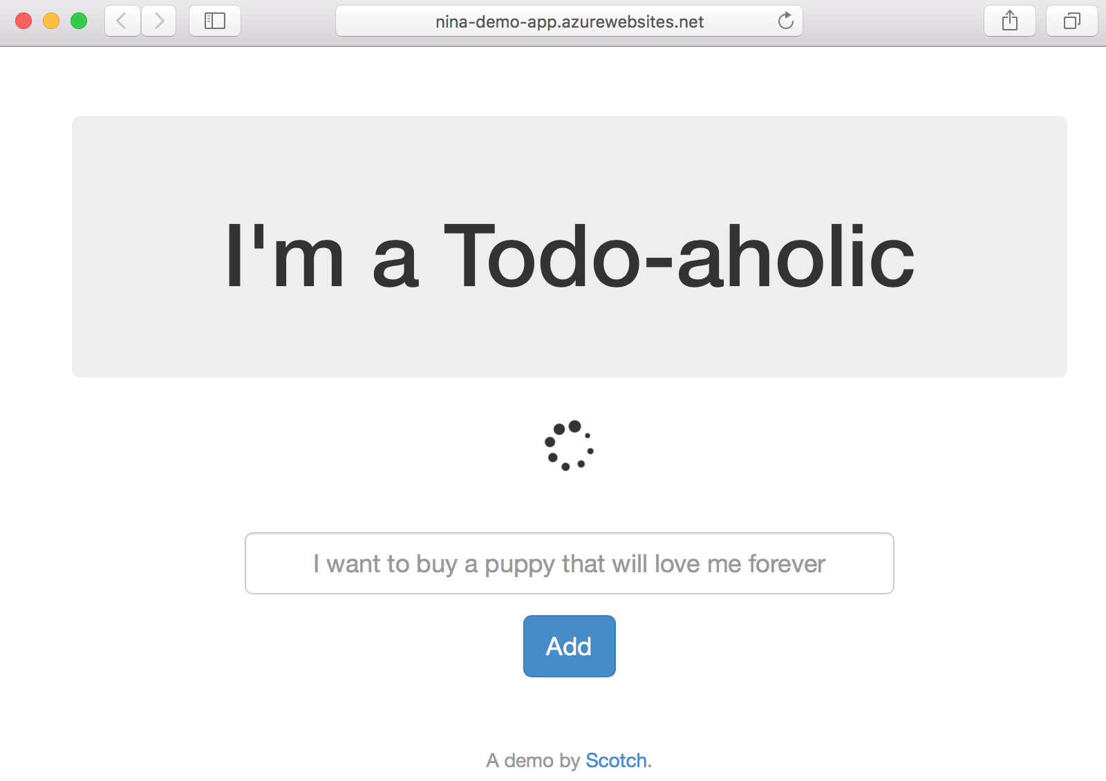 The demo makes use of a simple todo app created by and published by Scotch.io. It is a single-page MEAN application, and therefore, uses MongoDB as its database, Node/Express for the REST API/web server and Angular.js 1.x for the front-end UI. Use the following ToC to jump to particular sections of interest, otherwise, continue reading ahead.