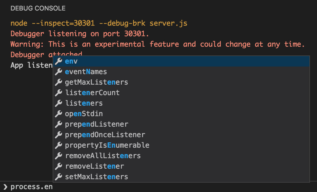 , you should have noticed that VS Code displayed the available members of the Node.js process