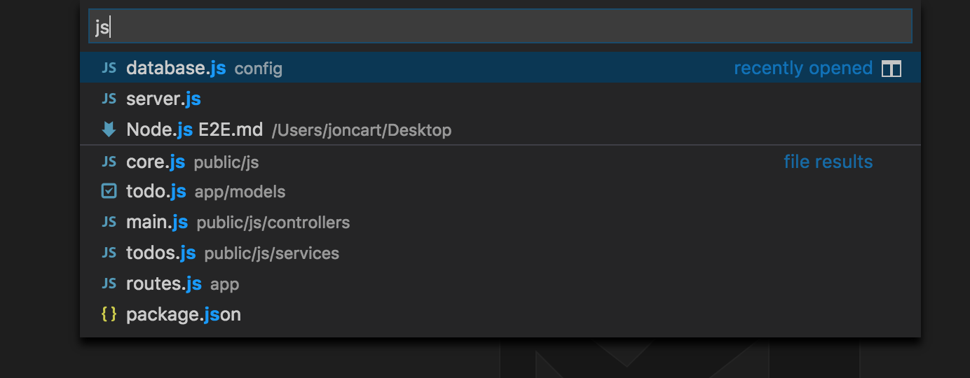 , which lets you see all of the JavaScript/JSON files in the project, along with the directory they're within. Once again, this dialog supports the same "fuzzy search" as the command palette, so it's pretty flexible. -
