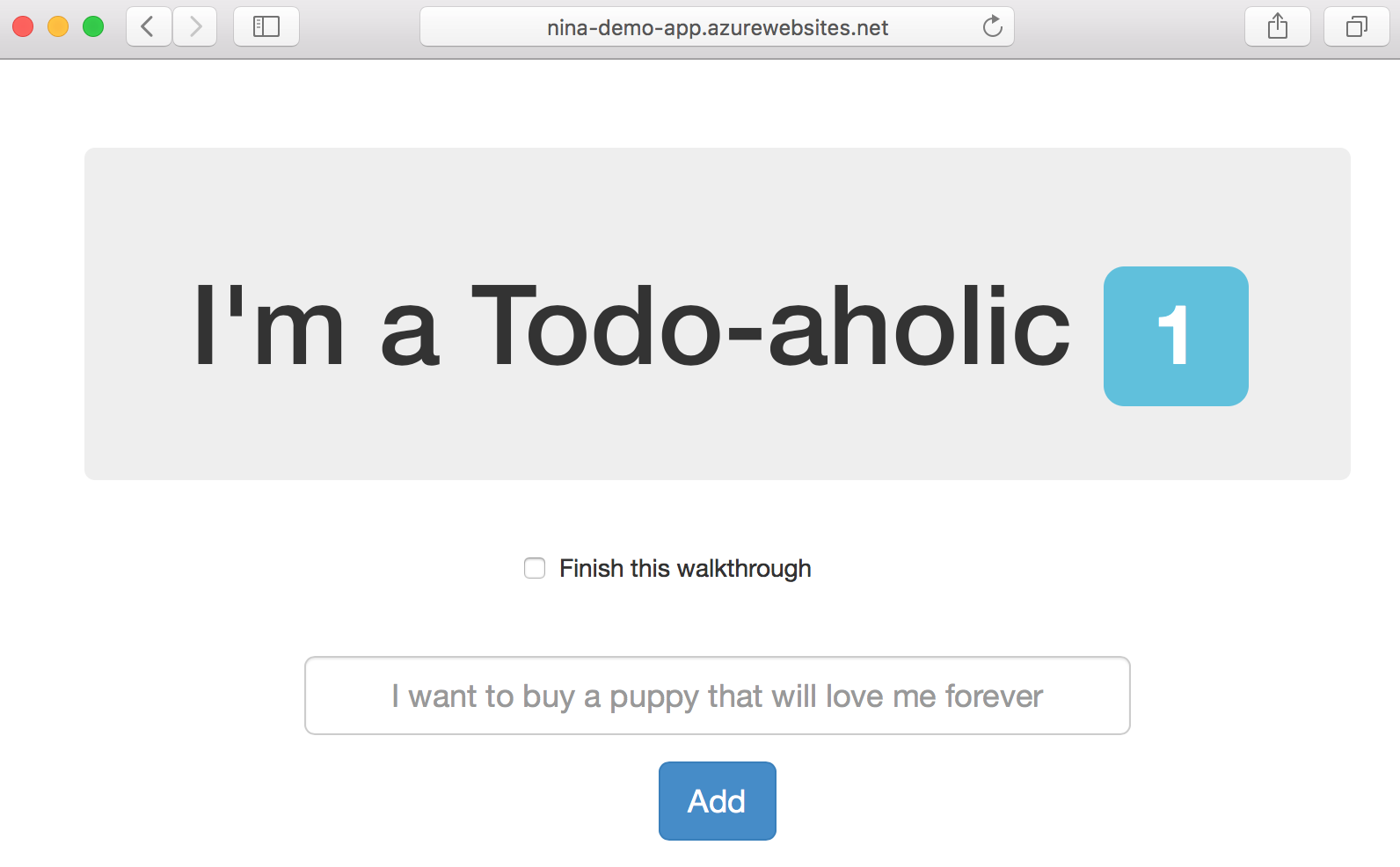 button, and then return to your browser and refresh it. Try adding and removing a todo item, to prove that the app now works without needing to change anything! We simply set the environment variable to our created DocumentDB instance, which is fully emulating a MongoDB database.