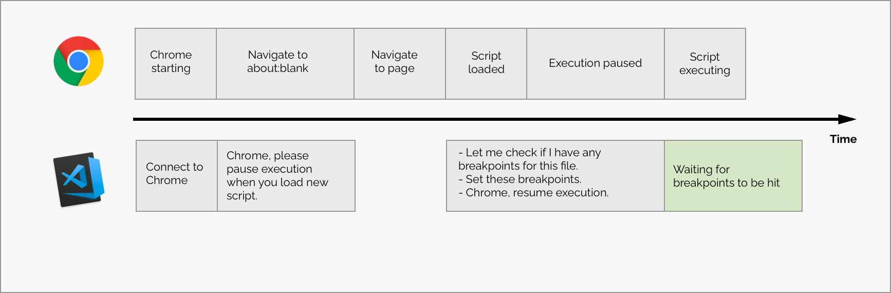 Many users have had the experience that their breakpoints aren't hit when launching Chrome. To add to their confusion, their breakpoints are hit after a simple page refresh. Why would that be? It's a bit complicated, but it comes down to a timing issue between VS Code and Chrome, which is best illustrated in a timeline: